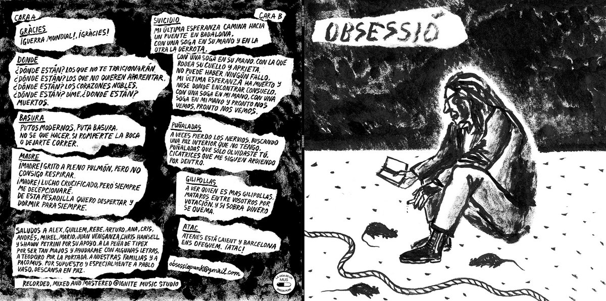 OBSESSIÓ’s debut is a blast of crude hardcore. Formed during the extremely dark times of August of 2018 and based between Athens and Barcelona the band first statement is an 8 track 12” at 45 rpm which knocks you down with the first chord. Kindly indebted to the living legacy of TOTALITÄR, CRUDITY and other Nordic Beat greats while keeping an unmistakably modern swagger. Breakneck pace and musical manufacture care of three Greeks who have set the stage for Angela’s no doubt bleak summary of the world, whose distinctively intimidating and minimal powerhouse voice crashes across OBSESSIÓ’s music. No songs over 2 minutes, no frills or tricks, no contemplative pondering on delicate matters, and most of all no fucking melody.